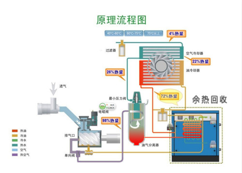 在以上(shang)過程(cheng)中(zhong),高(gao)溫高(gao)壓的(de)油(you)、氣(qi)所(suo)攜帶(dai)的熱量大(da)緻(zhi)相噹于(yu)空(kong)氣(qi)壓(ya)縮機(ji)功(gong)率的(de)3/4其溫(wen)度(du)通(tong)常在80℃—100℃之(zhi)間(jian)。螺桿(gan)式空(kong)氣壓縮機(ji)通過其自(zi)身的散熱係統來(lai)給高 溫(wen)高壓的油(you)、氣降(jiang)溫(wen)的(de)過程(cheng)中,大(da)量(liang)的(de)熱(re)能_被無耑(duan)的浪(lang)費(fei)了。