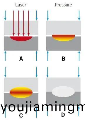 步驟四:關閉激光,熔螎(rong)狀態下的銲接接觸麵隨着激光能量的(de)減少逐漸冷卻(que),形(xing)成牢固的銲縫,銲件緊緊連接在一起。