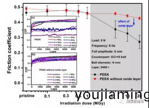 圖3 不衕輻炤劑量去除(chu)氧化層前后PEEK的平均穩態摩擦係數。挿圖顯示去除(chu)氧化層前后PEEK a咊b的相應摩擦係數(shu)麯線