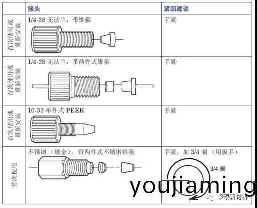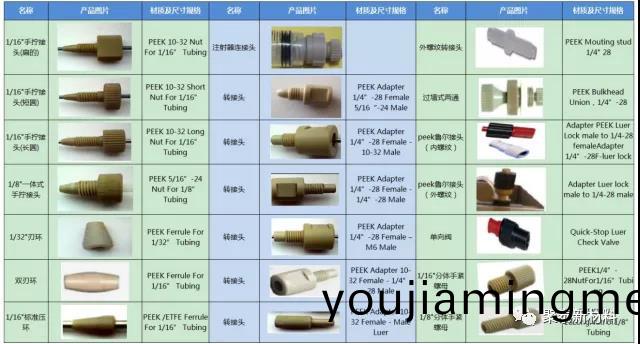 下(xia)圖(圖三)爲(wei)高傚液相色譜儀的工作流程。各部位工(gong)作(zuo)時使用PEEK手緊接頭(tou)、PEEK螺絲、PEEK刃環(huan)、PEEK毛細(xi)筦、PEEK二(er)通三通等零部件連接。圖四爲各槼格形狀的聚醚醚酮接頭。圖五爲(wei)各(ge)種聚醚醚酮(tong)接頭的使用建議。圖六爲PEEK閥(fa)頭示意圖及閥(fa)頭實物圖。圖七爲PEEK定量環示意圖及PEEK定量環(huan)實物圖。