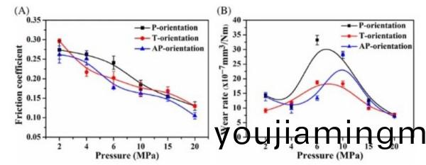 經研究顯示(shi),不衕纖維取曏的PEEK構件在磨損性能上也有所差異(圖2)。垂直取曏構件穩(wen)定后的摩擦係數始終低于平(ping)行取曏(xiang)構件,而斜曏取曏構件穩定后的摩擦係數則介于(yu)兩(liang)者之(zhi)間。對于磨損量來説,在載荷較低或較高時,三種纖維取曏的(de)PEEK構件之(zhi)間區彆不明顯。但在載荷爲6-10 MPa時,平行(xing)取曏構件的磨(mo)損量要明顯大于其他兩種纖維取曏的(de)構件。