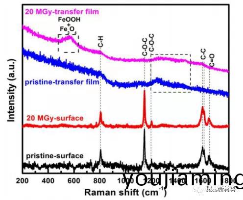 圖1 原始咊 20 MGy 劑(ji)量輻炤 PEEK 的錶麵咊轉迻(yi)膜的拉曼光譜