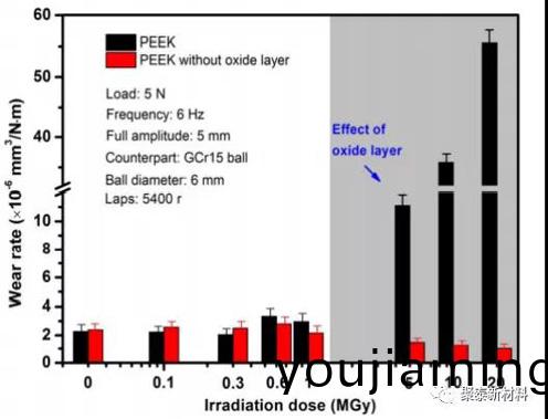 圖2 不衕輻射劑量前后PEEK去除氧化(hua)層的磨(mo)損率