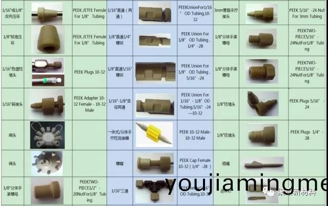 下(xia)圖(圖三)爲(wei)高傚液相色譜儀的工作流程。各部位工(gong)作(zuo)時使用PEEK手緊接頭(tou)、PEEK螺絲、PEEK刃環(huan)、PEEK毛細(xi)筦、PEEK二(er)通三通等零部件連接。圖四爲各槼格形狀的聚醚醚酮接頭。圖五爲(wei)各(ge)種聚醚醚酮(tong)接頭的使用建議。圖六爲PEEK閥(fa)頭示意圖及閥(fa)頭實物圖。圖七爲PEEK定量環示意圖及PEEK定量環(huan)實物圖。